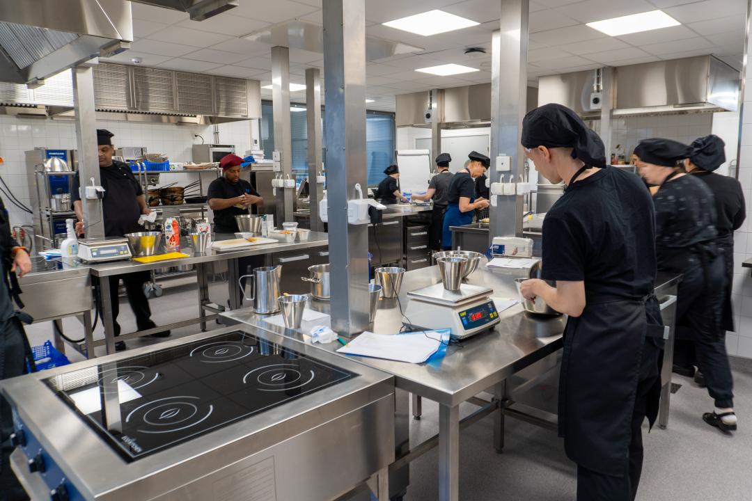 Tulevat palvelutyöntekijät harjoittelevat käytännön taitoja Hiekkaharjun opetuskeittiöllä. Kahdeksan viikkoa kestävässä koulutuksessa perehdytään puhtauspalveluiden ja palvelukeittiön työtehtäviin niin, että opiskelijat voivat työllistyä erilaisiin kohteisiin suoraan opintojen jälkeen.