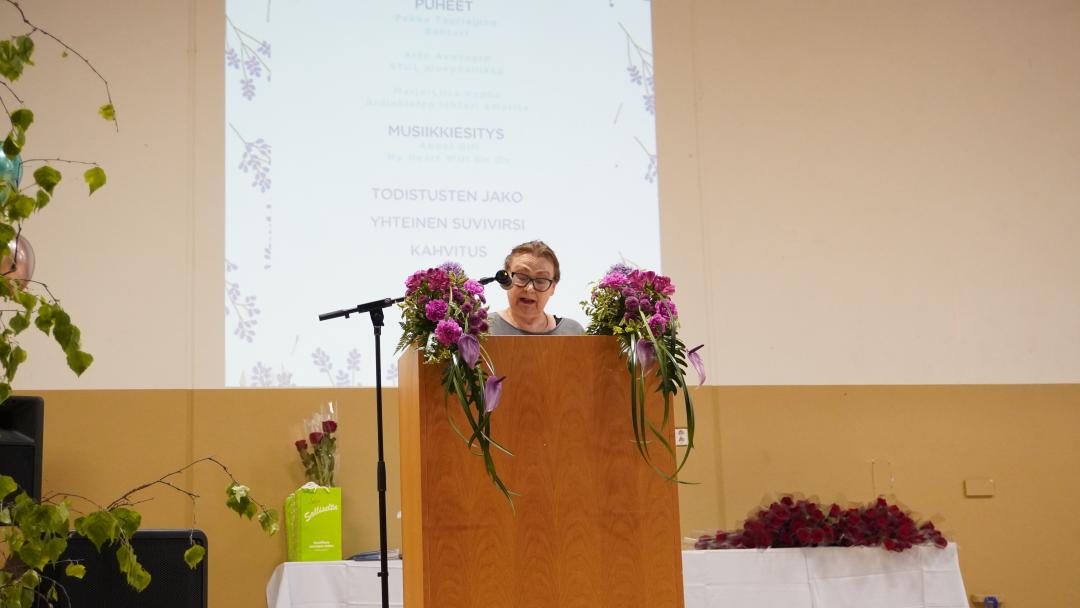Äidinkielen lehtori, emerita, Marja-Liisa Ruoho puolestaan kertasi puheessaan vaiherikasta työuraansa Myyrmäen opettajana. Vuosien varrella kommelluksiltakaan ei vältytty, ja Ruohon kertomus sai monta hymyä yleisön huulille.