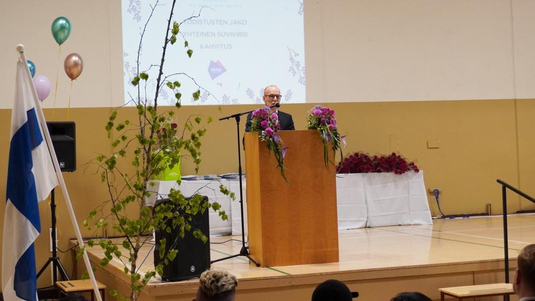 Rehtori Pekka Tauriainen onnitteli valmistuneita ja muisteli Myyrmäen historiaa.
